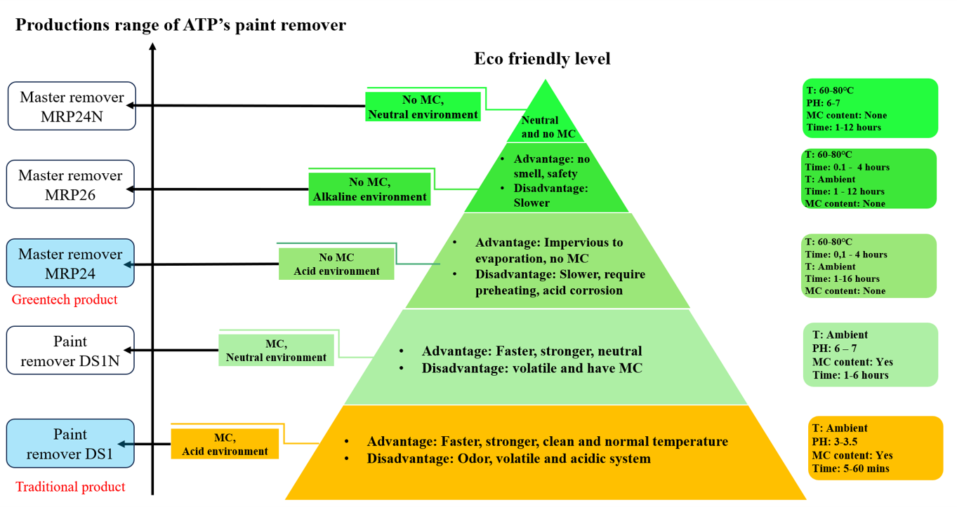 Trước những yêu cầu ngày càng khắt khe của thị trường về hiệu quả tẩy sơn, an toàn vận hành và yếu tố môi trường, các giải pháp truyền thống dần bộc lộ nhiều hạn chế. ATP đã tập trung nghiên cứu và phát triển các dòng hóa chất tẩy sơn chuyên dụng, được thiết kế linh hoạt theo từng nhu cầu thực tế của doanh nghiệp. Từ các sản phẩm tẩy sơn tốc độ cao cho dây chuyền sản xuất lớn, đến các giải pháp thân thiện môi trường, an toàn cho người sử dụng – ATP mang đến danh mục sản phẩm đa dạng, tối ưu cả về hiệu quả xử lý lẫn chi phí vận hành.
